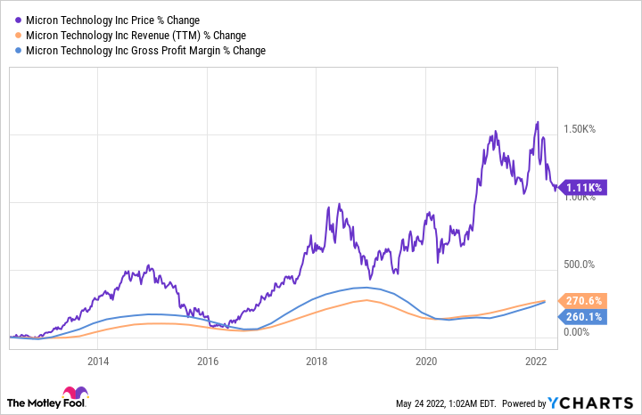 Micron Technology stock has shot up roughly 1,100% over the past decade, driven by healthy growth in the company's revenue, margins, and earnings.