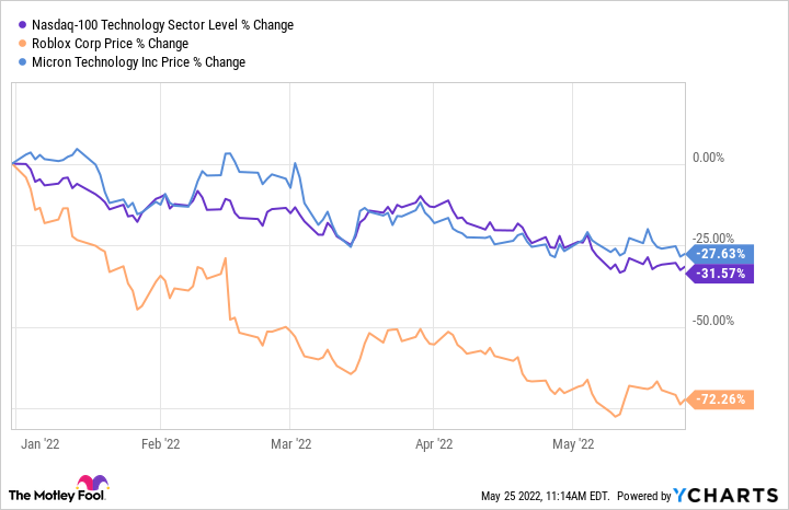 Micron Technology($Micron Technology(MU)$ )andRoblox($Roblox Corporation(RBLX)$ )are two tech stocks that are available at attractive valuations right now following their horrid performance on the market this year.
