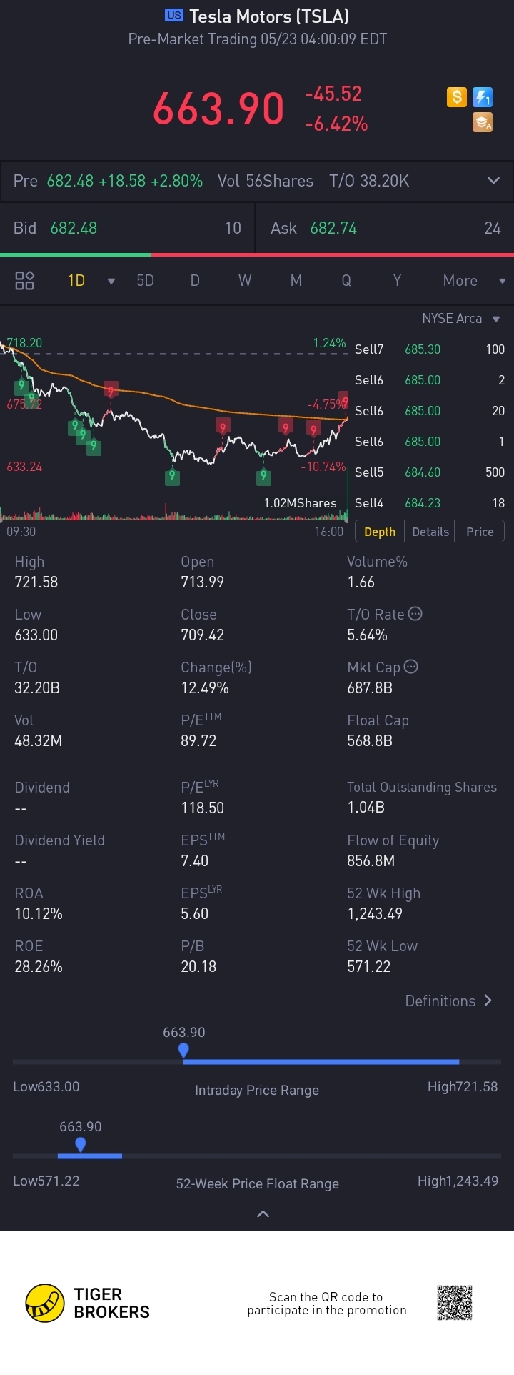 $Tesla Motors(TSLA)$my prediction is today will close at 700 and above.