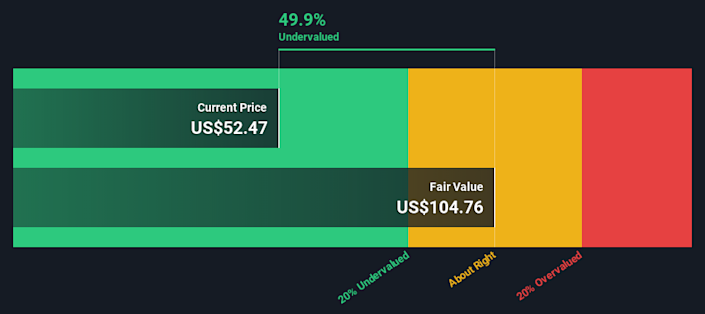 The total value, or equity value, is then the sum of the present value of the future cash flows, which in this case is US$588b. The last step is to then divide the equity value by the number of shares outstanding. Relative to the current share price of US$52.5, the company appears quite undervalued at a 50% discount to where the stock price trades currently. Remember though, that this is just an approximate valuation, and like any complex formula - garbage in, garbage out.