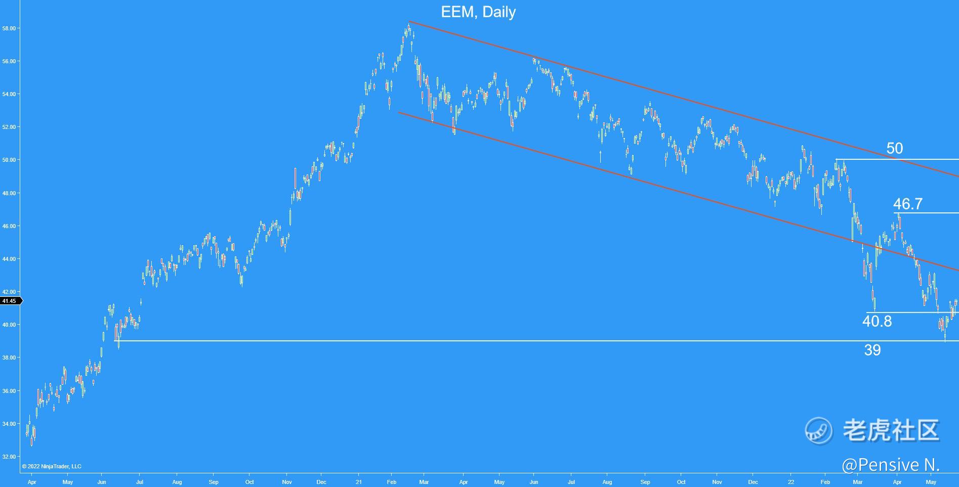 - EEM has rallied above resistance at $40.8, but remains below its bearish channel