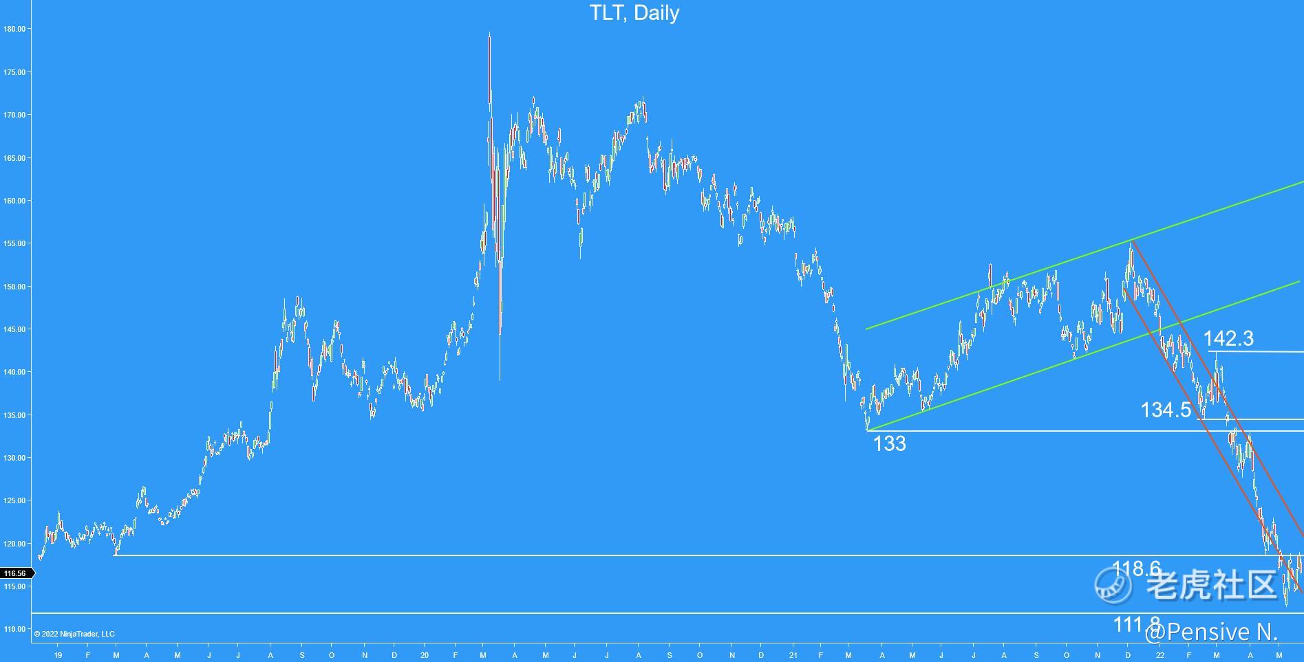 - TLT continues to trade between critical support ~$111 and resistance at $118.6