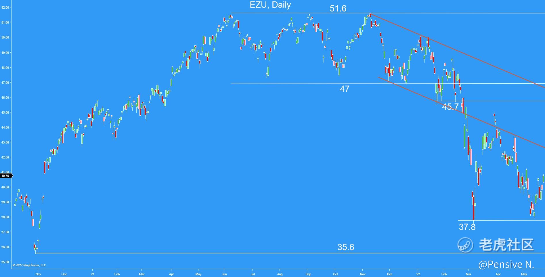 - EZU has managed to rally higher after finding support at $37.8 two weeks ago, and could be in the process of forming a wide range