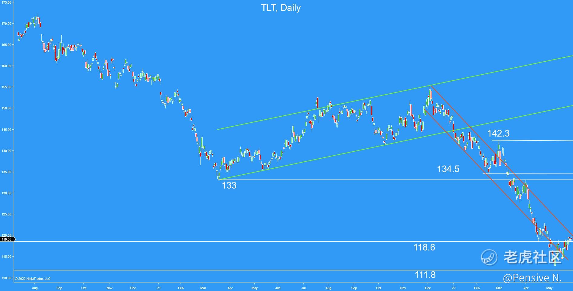 - TLT has moved above critical support ~111 and is currently trading just above 118.6 resistance