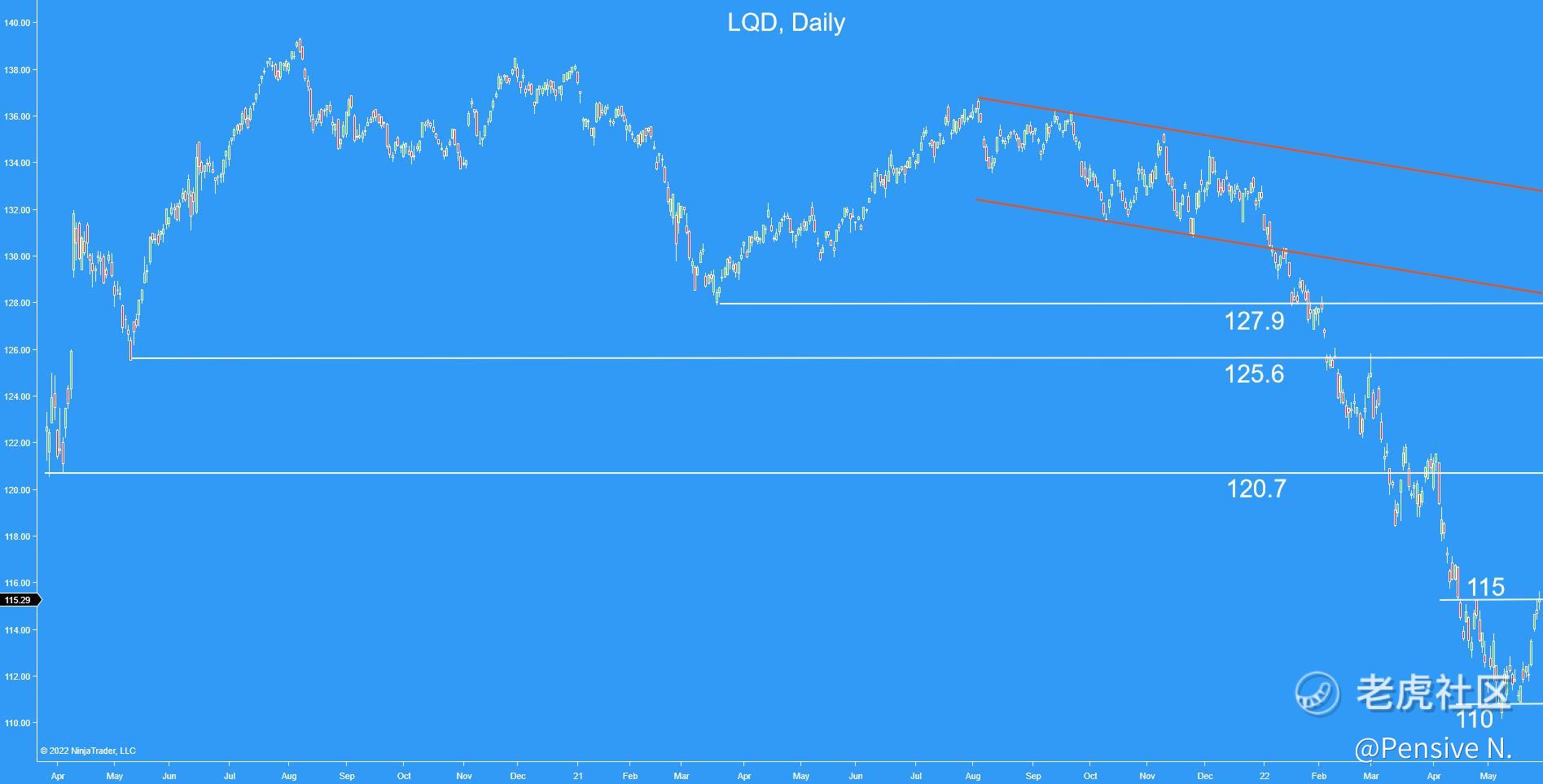 - LQD has rallied strongly off its recent lows ~110, and is now testing resistance at 115