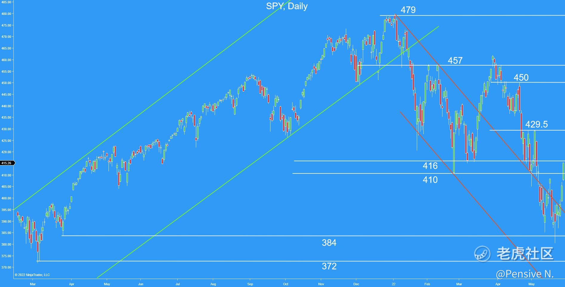- SPY has rallied out of its bearish channel, and is now testing major resistance in the region between 410–416