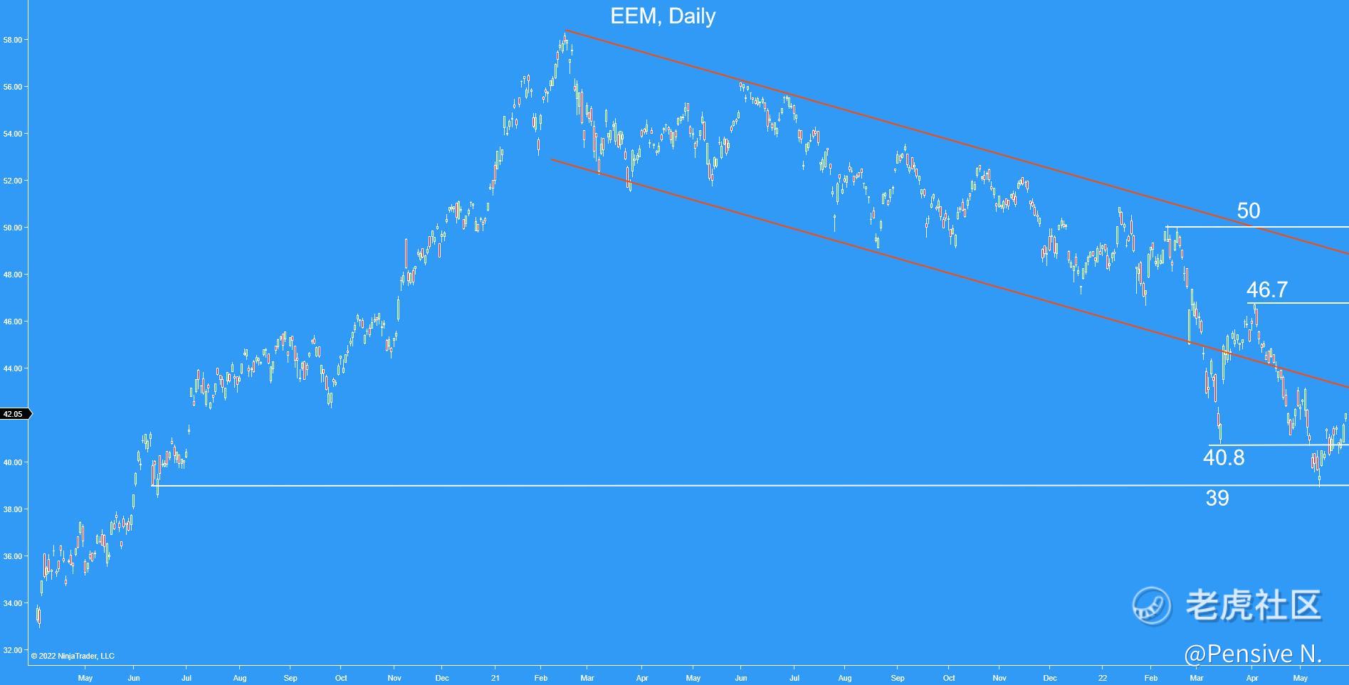 - EEM also kept rallying, and is approaching resistance ~43 (early May highs and the bottom of its bearish channel)