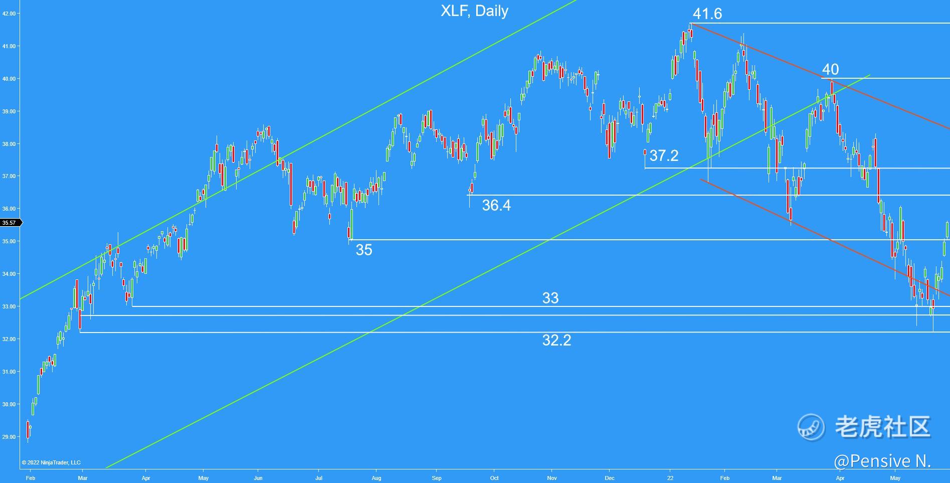 - XLF’s bounce has taken it above 35, with a move to test resistance in the 36–37 area now on the cards
