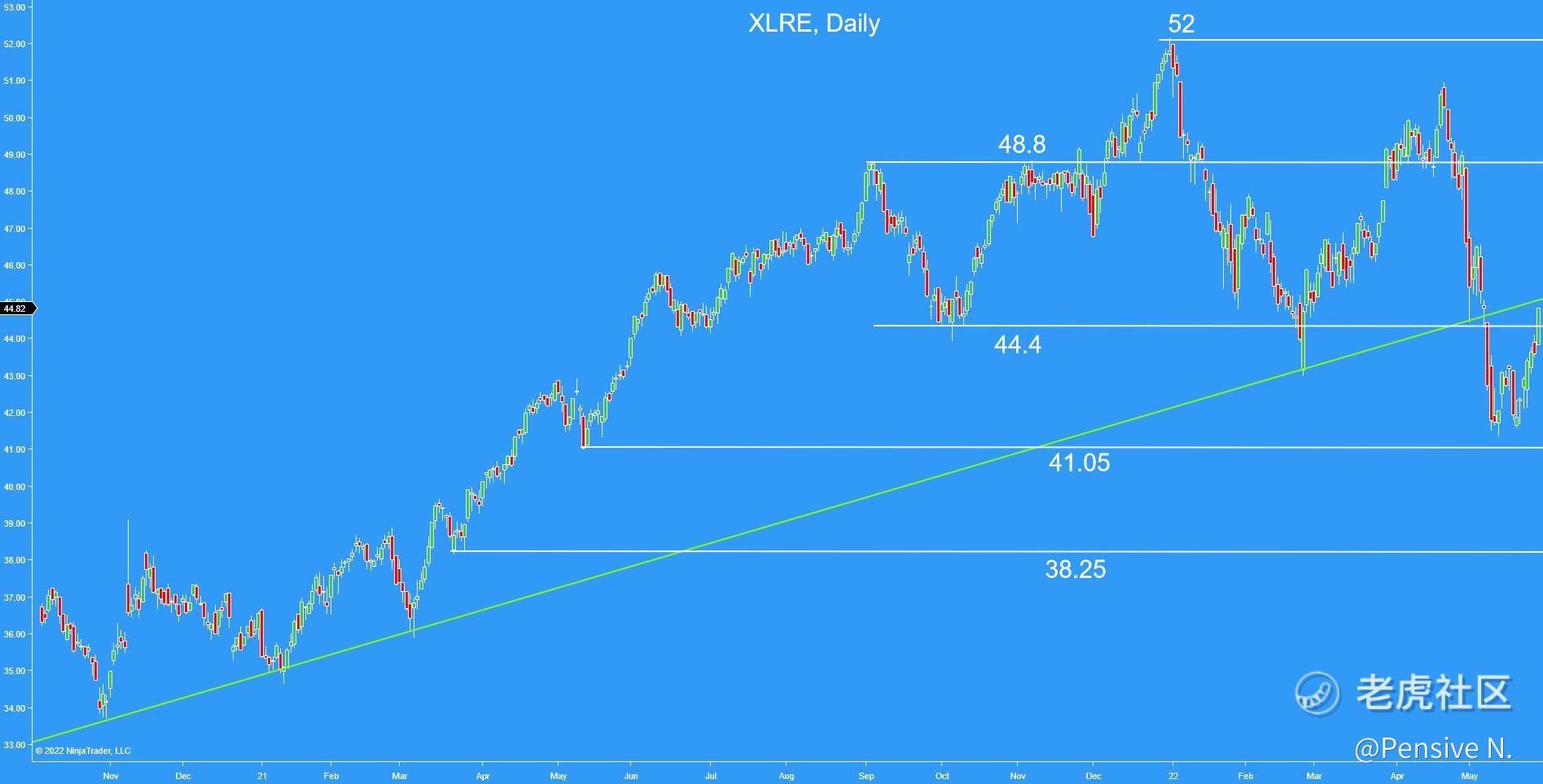 - XLRE found support just above 41, and has rallied above key resistance at 44.4