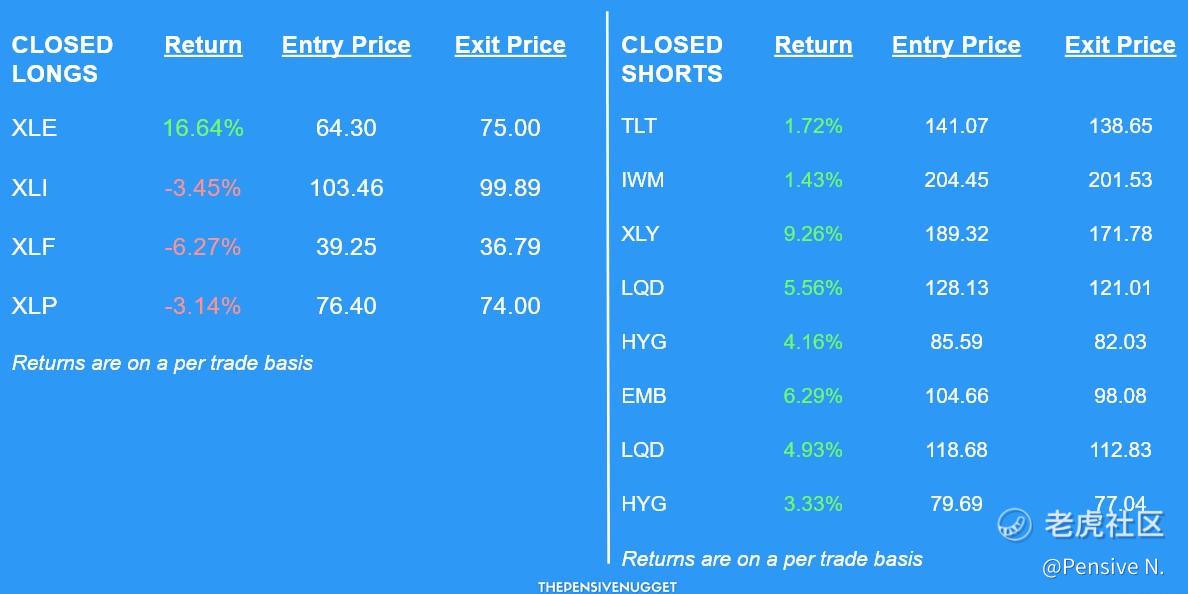 - Shorts in LQD and HYG stopped out as both spiked higher over the course of last week, for respective returns of 4.93% and 3.33%