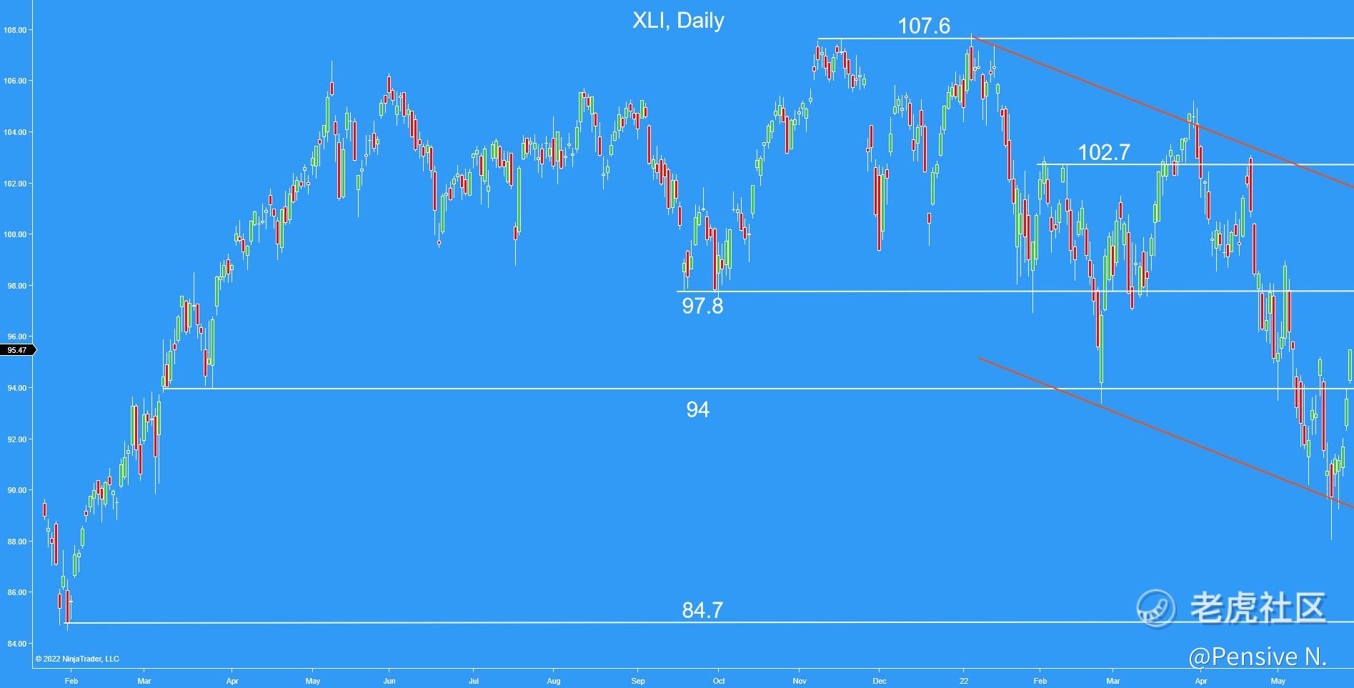 - Industrials have moved above resistance at 94, as XLI rallies along with everything else
