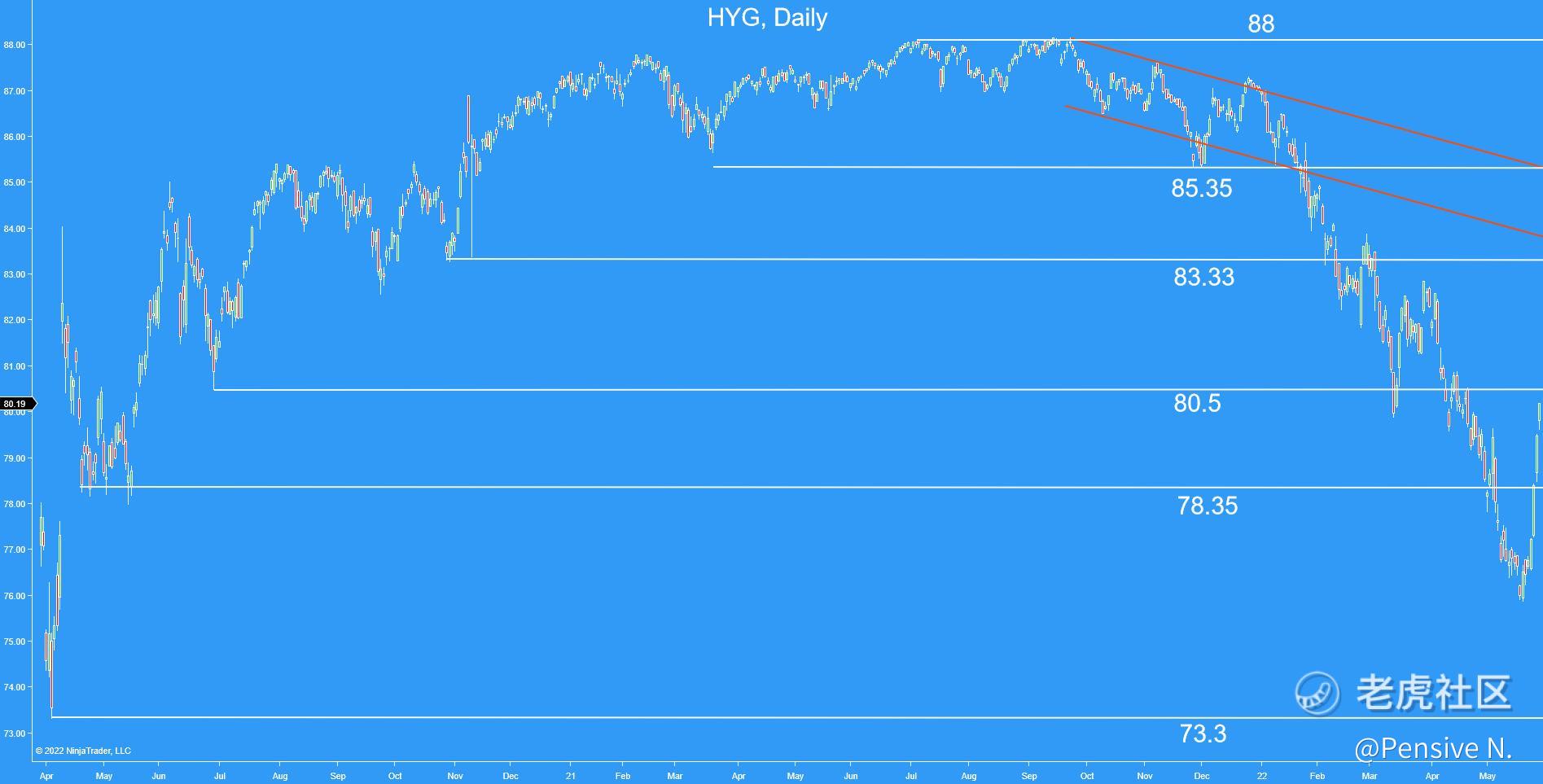 - HYG has shot above resistance at 78.35, and is now close to testing 80.5