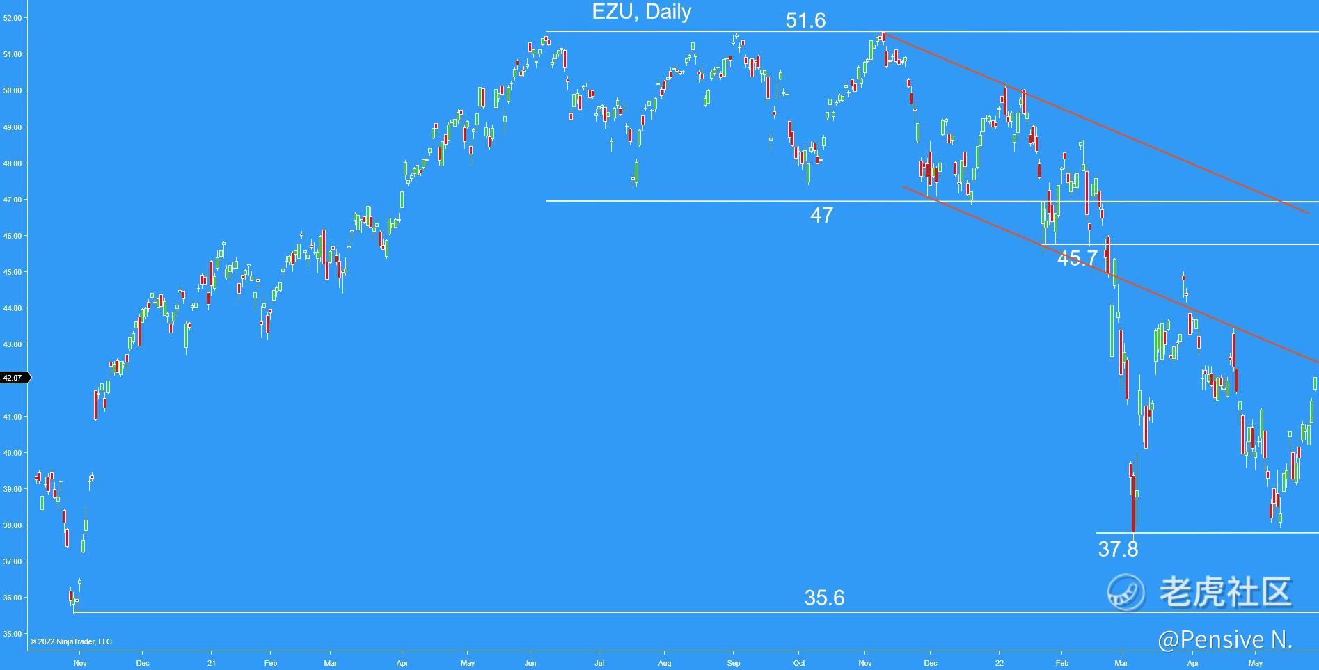 - EZU has continued to rally, and could soon test resistance at 42.5 at the bottom of its old bearish channel