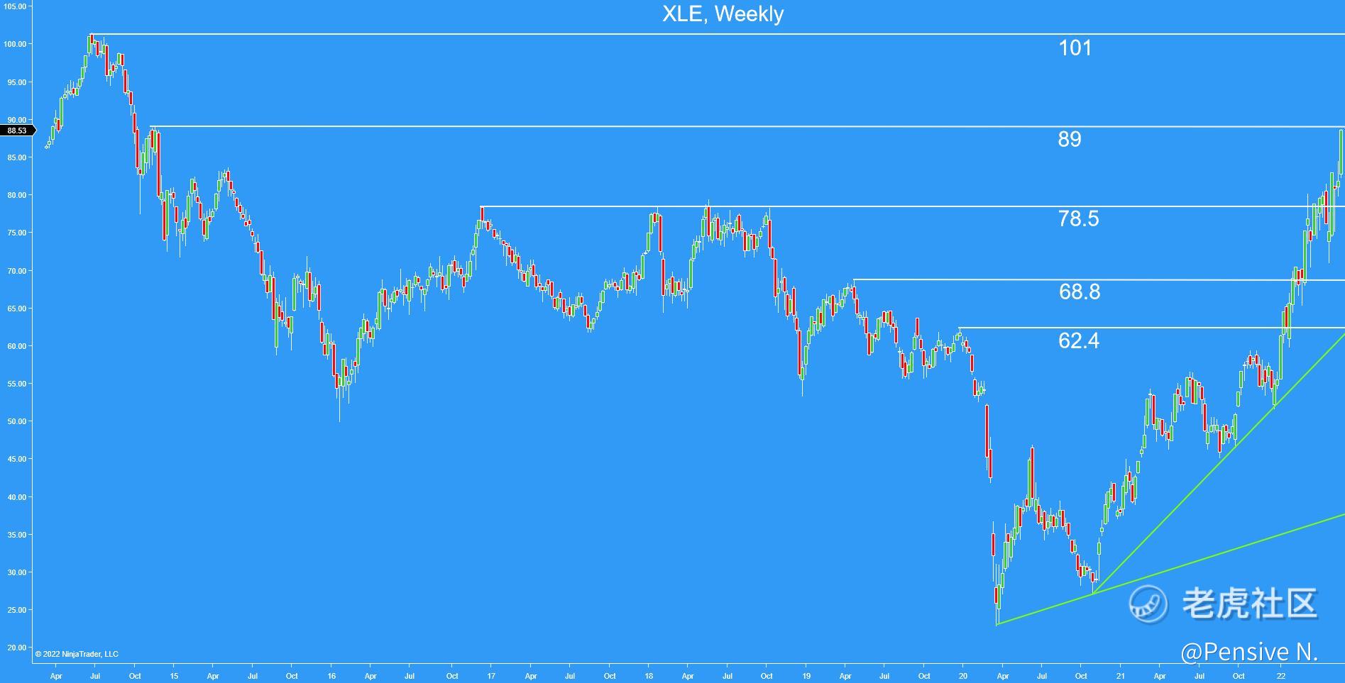 - XLE has shot higher again, and is now testing resistance at 89, with an eye on 2015’s high at 101