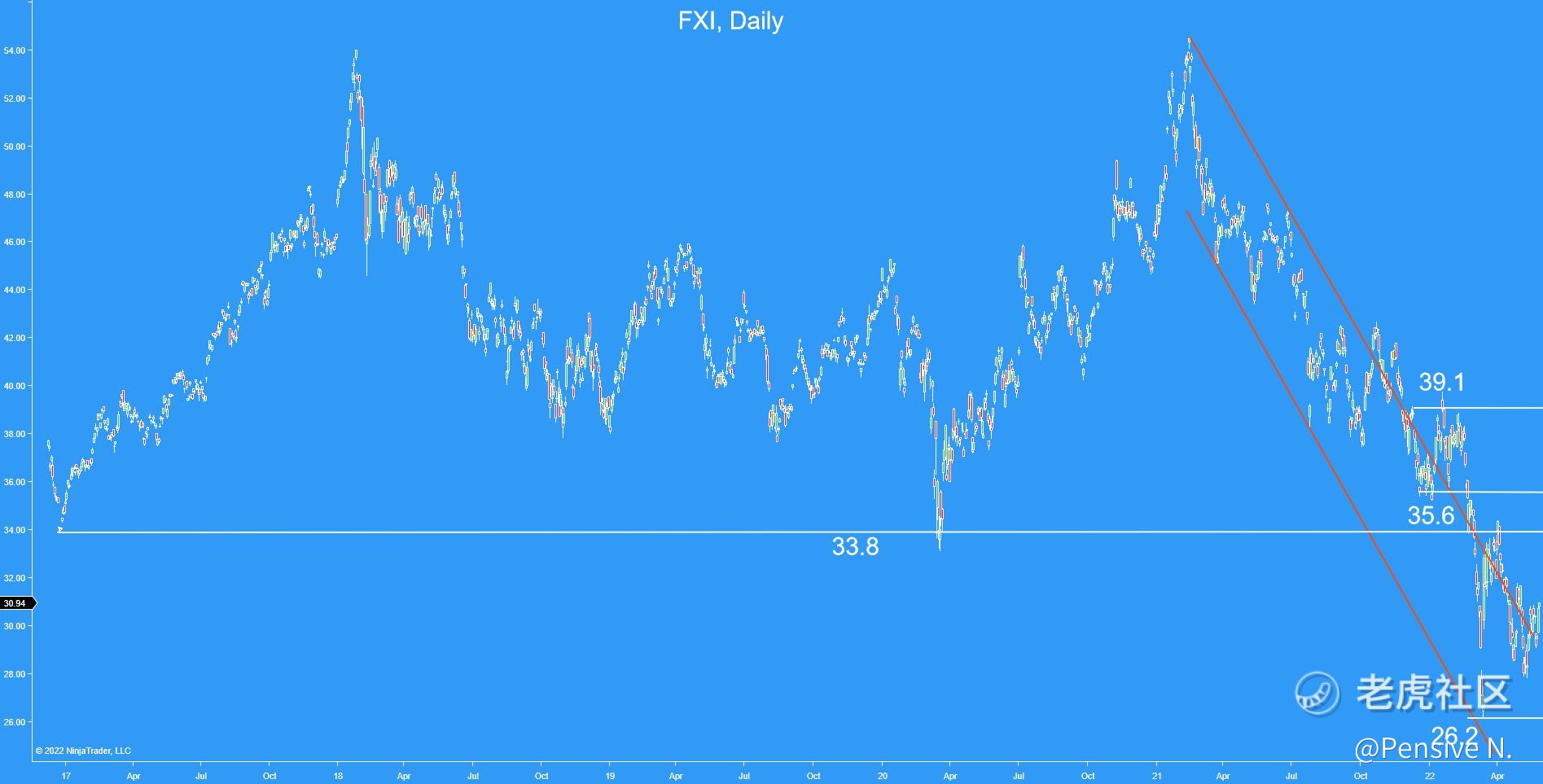 - FXI has begun to trade sideways, and remains between key resistance at 33.8, and major support at 26.2