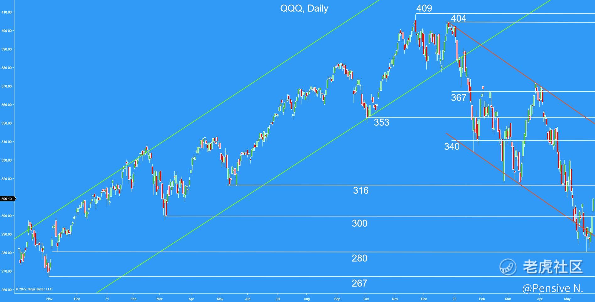 - QQQ broke above resistance at 300, and is moving to test the 316 level