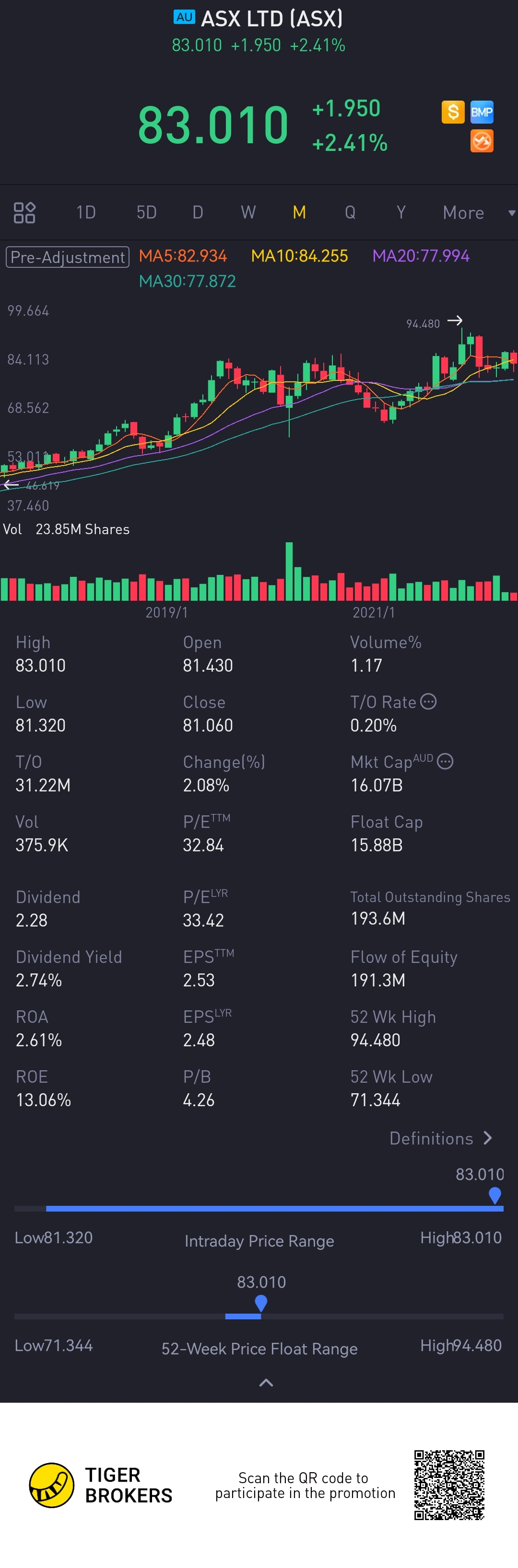 $ASX LTD(ASX.AU)$ This is a resilient counter in my view. Good or bad times, the stock market will still operate though lower turnover may affect their bottom line. But at the current price, I think it is still a little high. Maybe I will wait for it to pull back a little then I may consider starting a position.