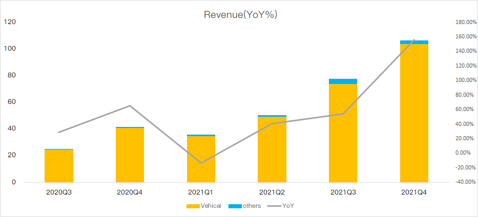In the fourth quarter, the LI revenue was 10.62 billion yuan, a year-on-year increase of 156.1%; Among them, automobile sales revenue was 10.38 billion yuan, up 155.7% year-on-year. In 2021, the annual revenue reached 27 billion yuan, a year-on-year increase of 185.6%.