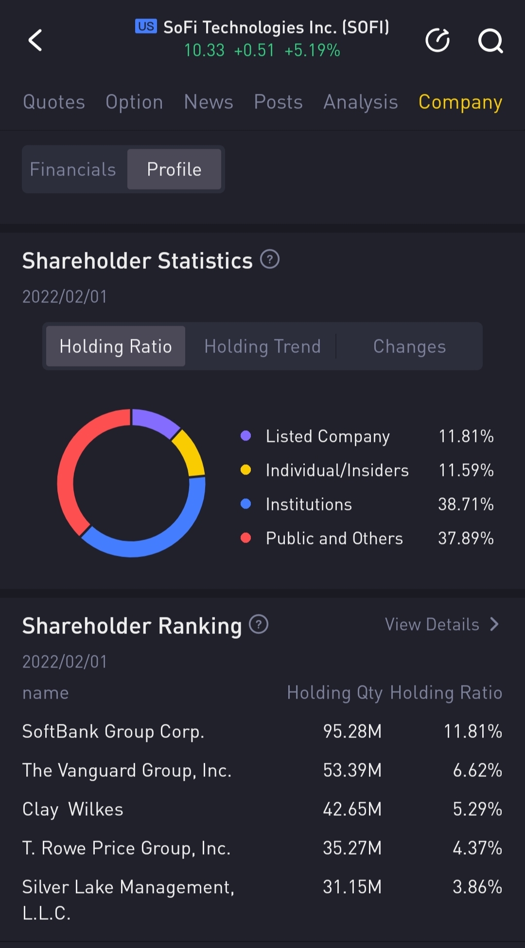 $SoFi Technologies Inc.(SOFI)$Institutions + Listed Companies + Insiders = 62.11%.