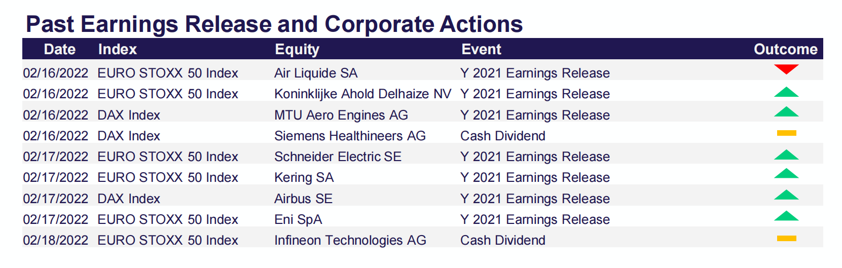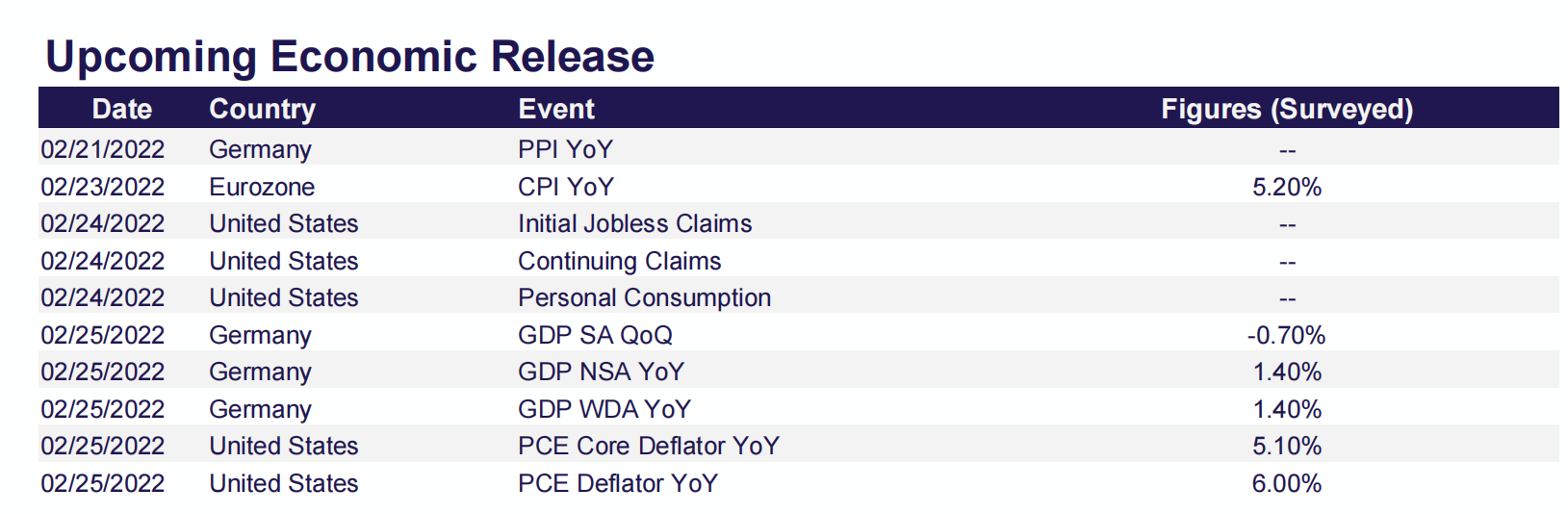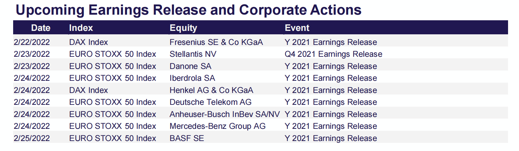 ▪While markets mainly took heed of the Russian-Ukraine tensions this week, investors can await more corporateearnings releases and economic data releases from Germany and Eurozone in the upcoming week.