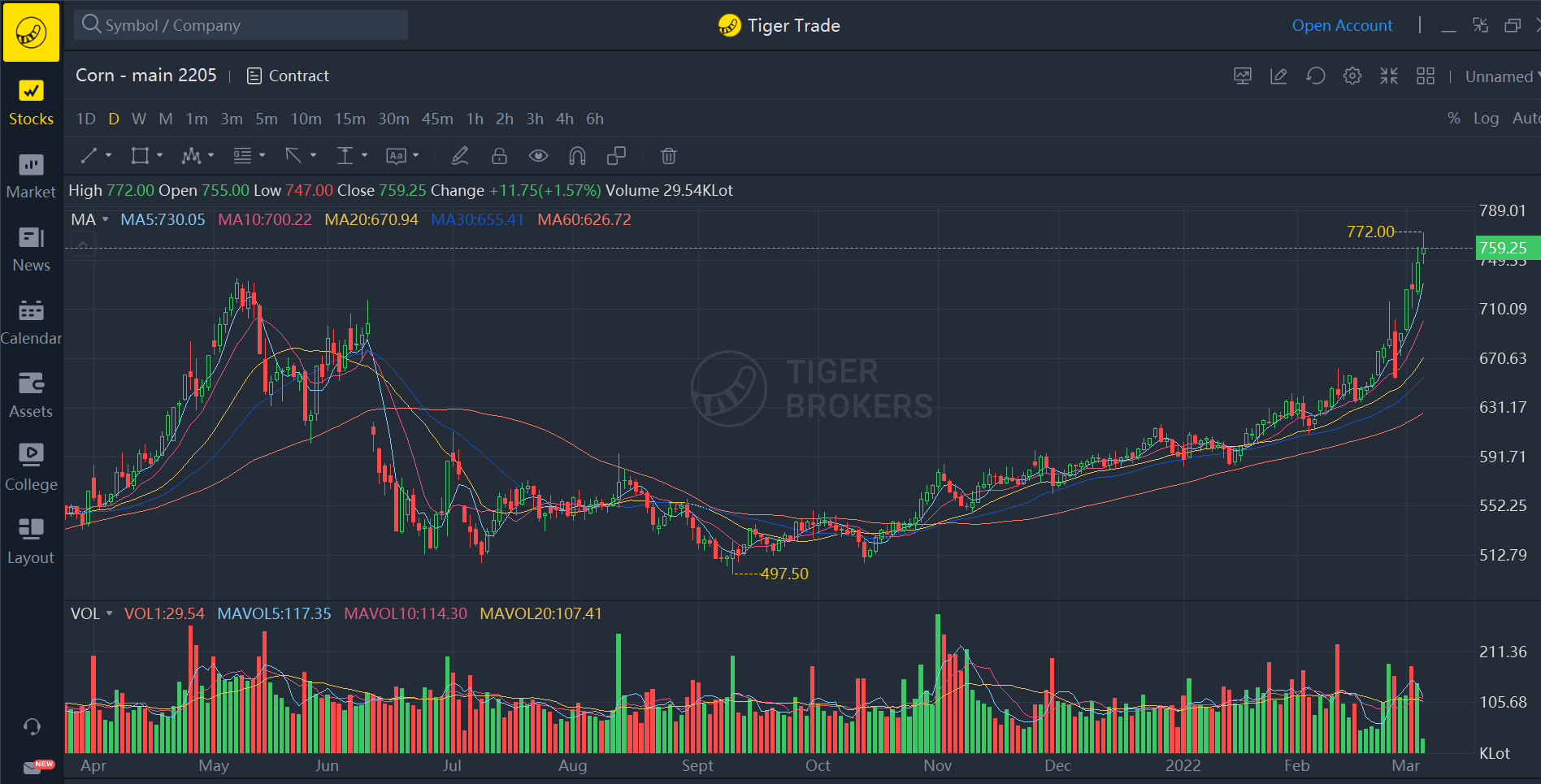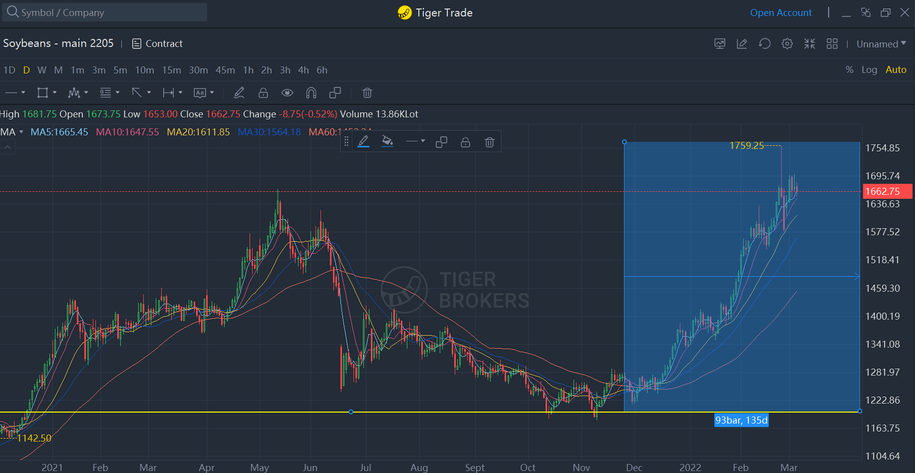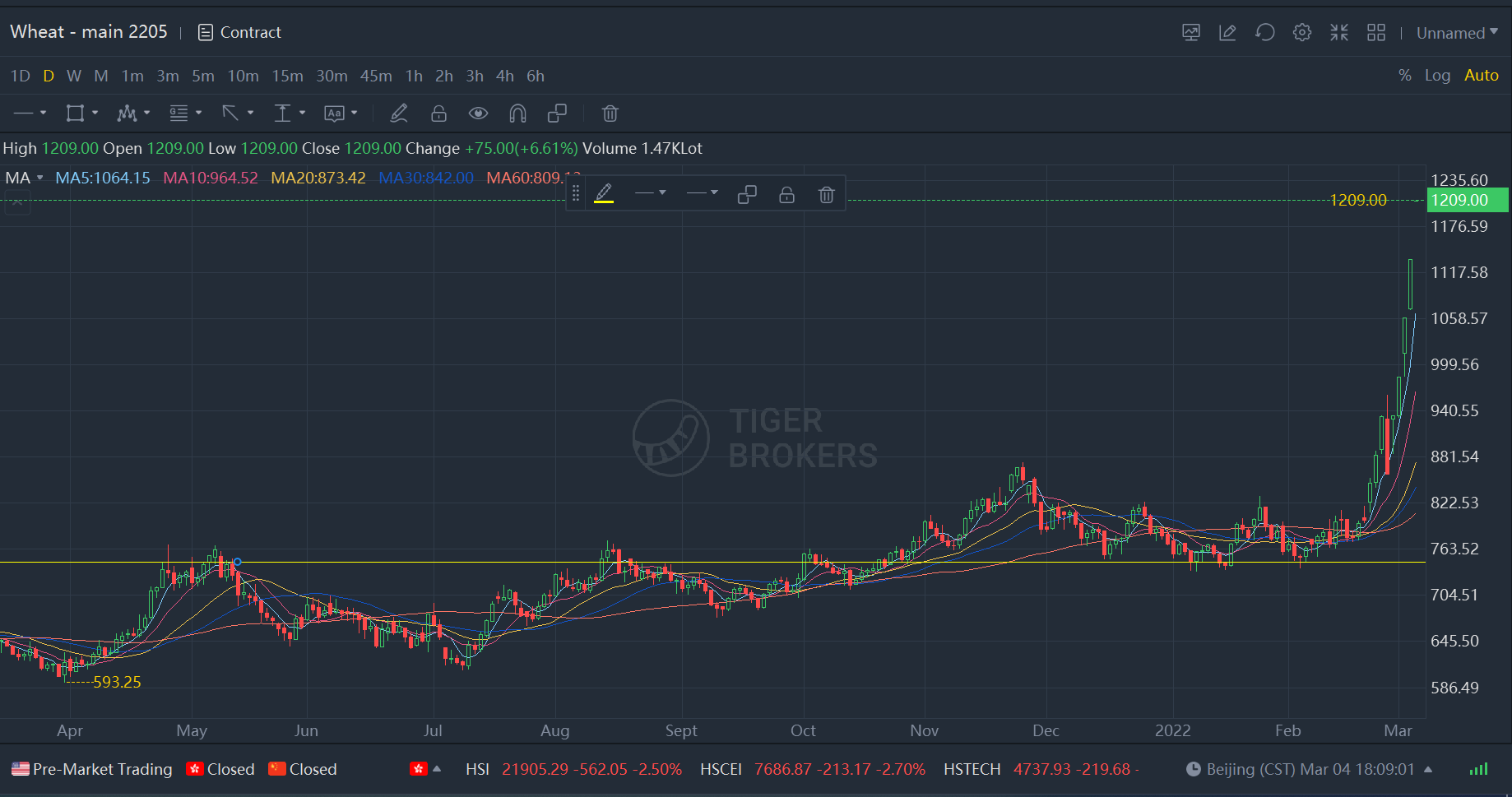 In just two days, $Wheat - main 2205(ZWmain)$ has risen around 20%. $Corn - main 2205(ZCmain)$ and $Soybeans - main 2205(ZSmain)$ prices are all up close to 10%.