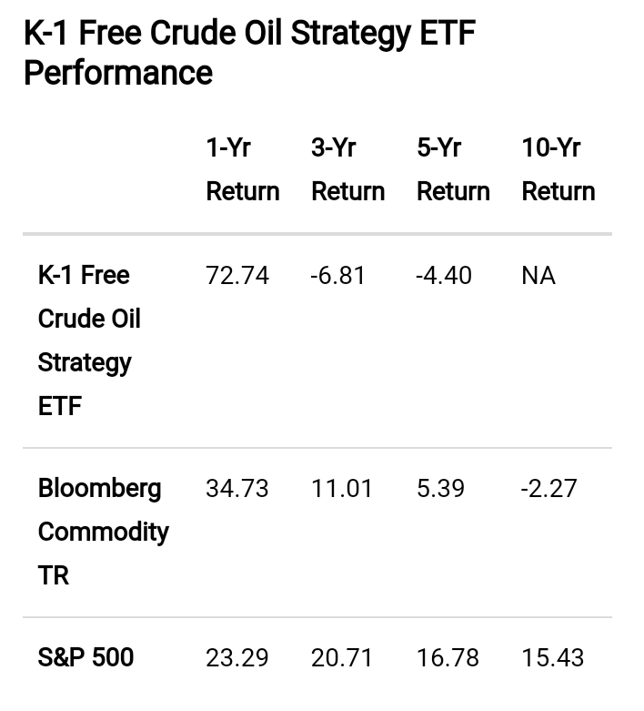 ProShares K-1 Free Crude Oil Strategy ETF ($(OILK)$) seeks investment results, that track the performance of the Bloomberg Commodity Balanced WTI Crude Oil Index. OILK is the first crude oil ETF that does not issue a K-1 to its shareholders, which may be attractive to some investors who wish to invest in oil ETFs but instead receive a 1099.