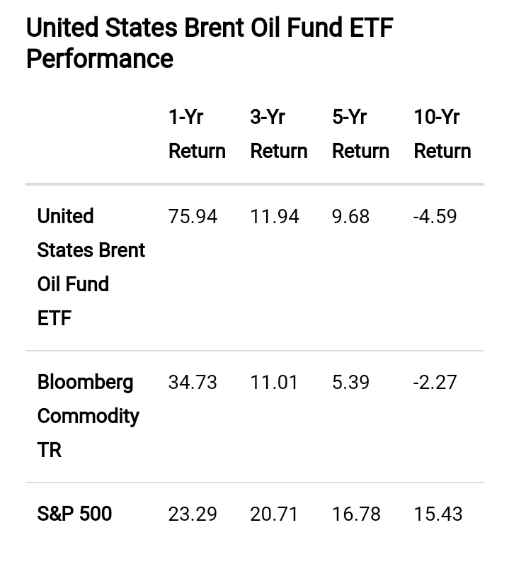 BNO significantly outperforms the broader index, Bloomberg Commodity TR, as well as the U.S. equity index, S&P 500 for the 1-year return. BNO's returns also outperform the commodity index in longer periods. However, USO's longer period returns are far lower than the S&P 500.