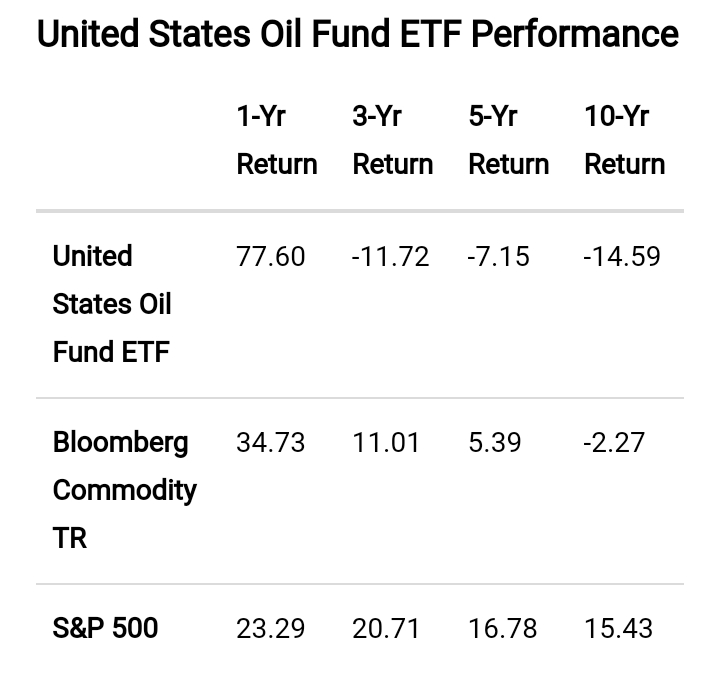 USO significantly outperforms the broader index, Bloomberg Commodity TR, as well as the U.S. equity index, S&P 500, for the 1-year return. However, USO's longer period returns are far lower compared to a basket of commodities or to the S&P 500.