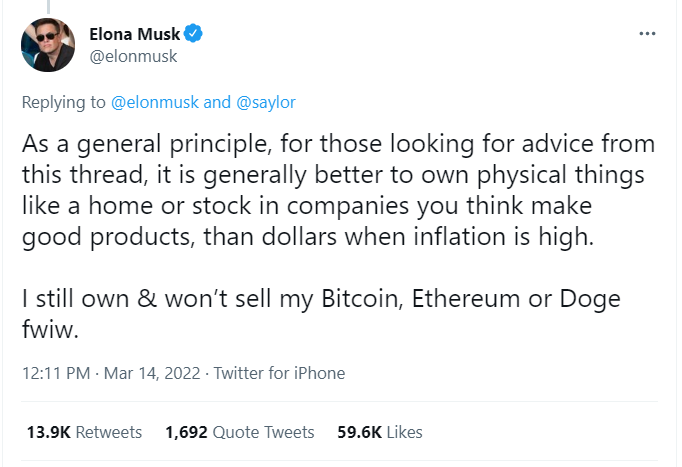 What Musk says on how to invest during a high inflation period: The second half of his tweet lines up with investing advice Buffett, CEO of Berkshire Hathaway, hasgiven in the past. Back in 2009, at the tail end of the Great Recession, Buffett said at Berkshire Hathaway’sannual shareholder’s meeting that one of the best ways to protect against inflation is to own a part of “a wonderful business.”