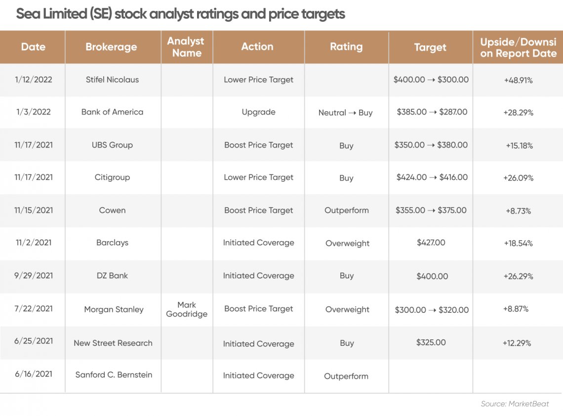 Sea stock was also rated a 'buy' based on the consensus views of 12 analysts compiled byMarketBeat, as of 14 January 2022. All analysts rated 'buy' for Sea stock with a Sea Limited stock price target of $351, representing a 94% increase from the last price of $180.55 (14 January).