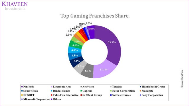 Based on the chart, Nintendo (OTCPK:$(NTDOY)$) and Electronic Arts ($(EA)$) have the highest share of top-grossing gaming franchises including Pokemon, Super Mario, Star Wars and FIFA. In third place, Activision's top franchises include Call of Duty, Warcraft and Candy Crush. In comparison, Microsoft has a significantly lower share than Activision. Thus, we believe Microsoft stands to benefits from the deal by acquiring major gaming franchises by Activision. The map below shows the ecosystem of gaming companies including Microsoft with Activision subsidiaries.