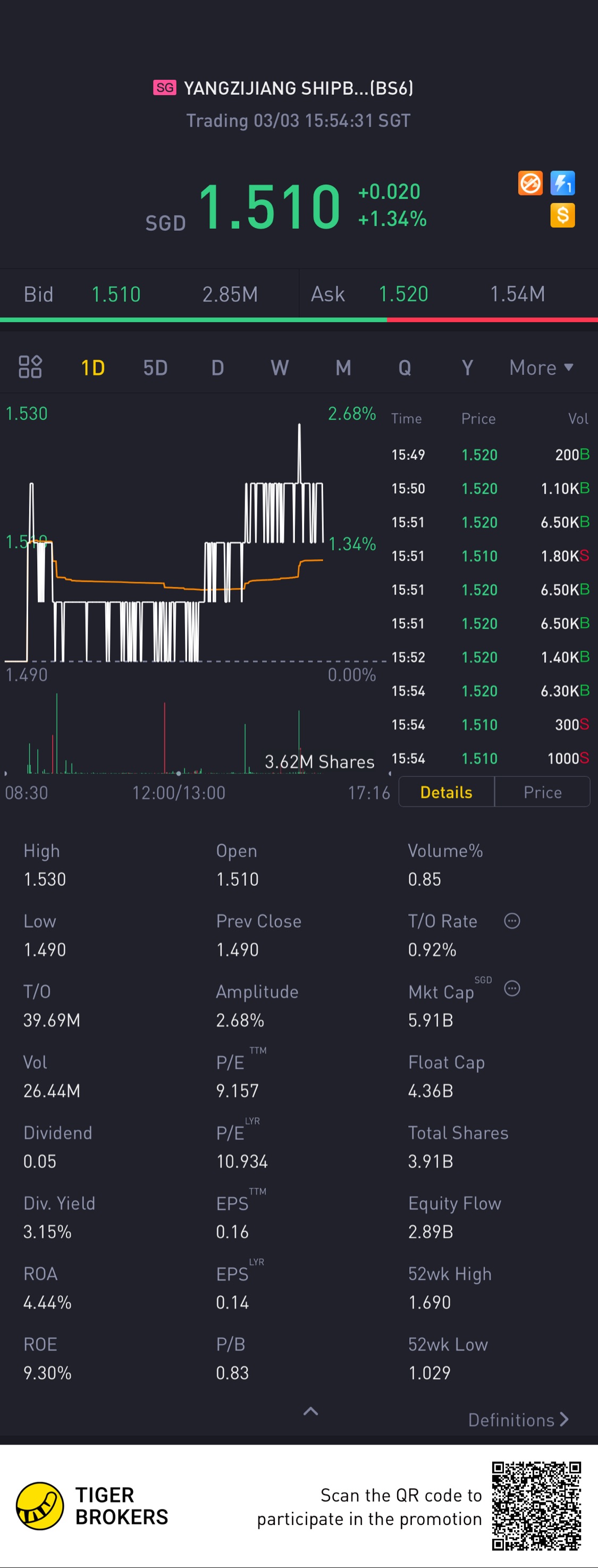 $YANGZIJIANG SHIPBLDG HLDGS LTD(BS6.SI)$Sell all at 1.40 now increase like rocket 🚀