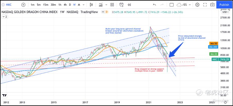 Zooming in to the sector in particular, using the popular NASDAQ Golden Dragon China Index (HXC) tracking many of the Chinese stocks, we can see a strong rebound when it broke the downtrend channel and from the horizontal strong support (red box) and back, stopping almost right in the middle of the downtrend channel.