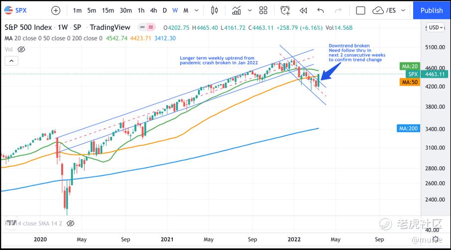 Starting with the broader Markets, using $S&P 500(.SPX)$ as the proxy, we can see on the weekly chart, the long green candle engulfing two previous weeks of red arrows to upside (bullish) and breaking the downtrend channel from January 2022.