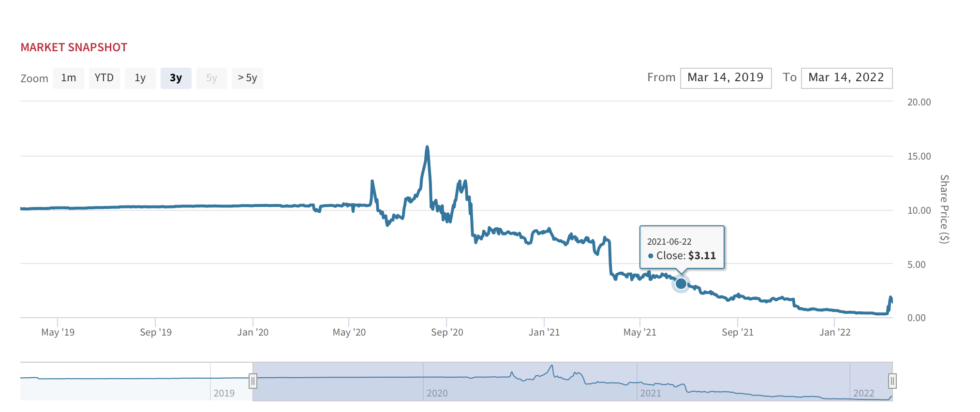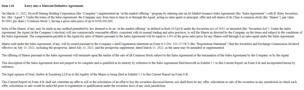 Hycroft: meme fumes. Hycroft is a deSPAC which closed back in May-2020 from a SPAC sponsored by Mudrick Capital. After hitting a peak of ~$15 in August 2020, HYMC stock has sunk steadily downward, trading at ~$0.30 before today’s announcement. Mudrick moved on to Mudrick Capital Acquisition II (MUDS), which was set to merge with baseball card and collectible company Topps before that deal fell apart last summer. According to AMC, the Hycroft Mine has about 15 million ounces of gold deposits and some 600 million ounces of silver deposit. Notably, HYMC is doing its own at-the-market-offering to capitalize on the stock pop.