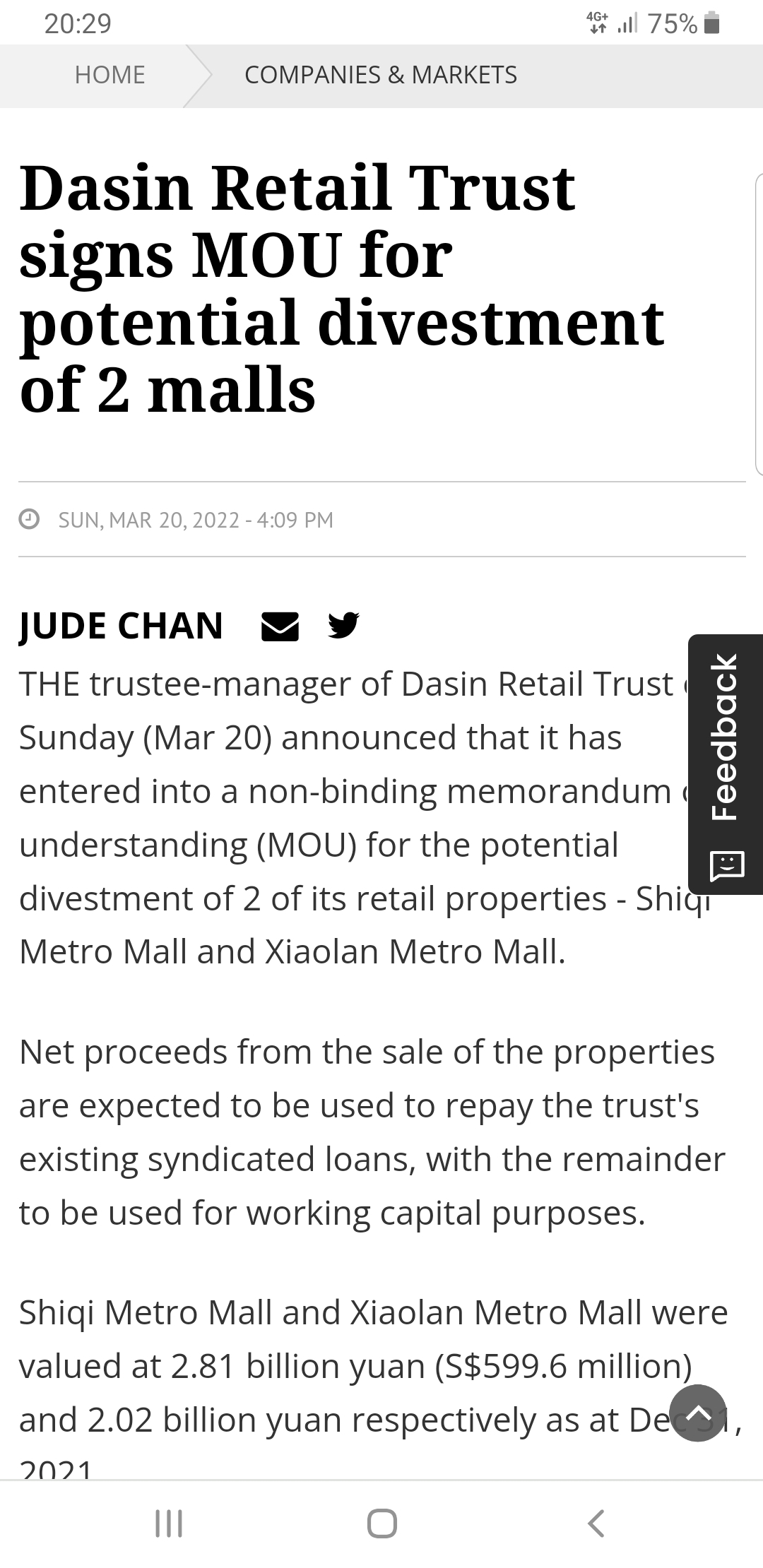 If DRT sells both Shiqi Mall and Xiaolan Mall, this is no longer a refinancing exercise but rather paying off its entire debt. Sounds strange for a REIT.