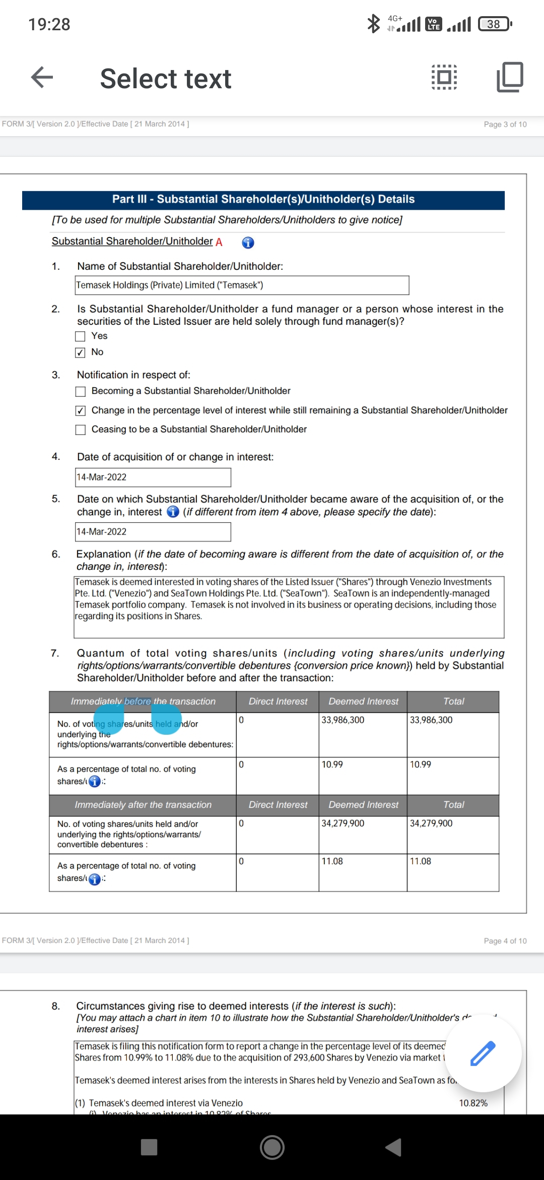 $AEM HOLDINGS LTD(AWX.SI)$Temasek further increased it holding to 11%, bought 293,600 shares on 14 March at average price of $4.17