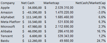 Mega-cap Net Cash to Market cap (my own excel sheet)(Author)