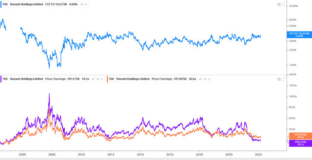 From a valuation standpoint for Tencent, I like to look at the P/E ratio (both the trailing and forward multiples) and the FCF/EV yield. I like to look at FCF/EV yield because it shows how much free cash flow attributable to shareholders the company is able to produce. Tencent has historically been between a 2% and a 4% FCF/EV yield. They are currently on the top of that range with 4.04%.