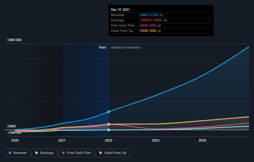 Following the upgrade, the current consensus from Li Auto's 20 analysts is for revenues of CN¥52b in 2022 which - if met - would reflect a huge 92% increase on its sales over the past 12 months. Losses are presumed to reduce, shrinking 13% from last year to CN¥0.28. Yet prior to the latest estimates, the analysts had been forecasting revenues of CN¥47b and losses of CN¥0.41 per share in 2022. So there's been quite a change-up of views after the recent consensus updates, with the analysts making a sizeable increase to their revenue forecasts while also reducing the estimated loss as the business grows towards breakeven.