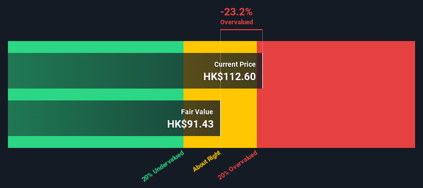 The total value is the sum of cash flows for the next ten years plus the discounted terminal value, which results in the Total Equity Value, which in this case is CN¥454b. To get the intrinsic value per share, we divide this by the total number of shares outstanding. Compared to the current share price of HK$113, the company appears slightly overvalued at the time of writing. The assumptions in any calculation have a big impact on the valuation, so it is better to view this as a rough estimate, not precise down to the last cent.