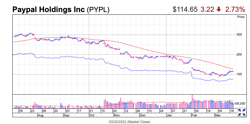 PayPal stock dropped almost 2% Wednesday, trading at 116.05. On March 8, the stock hit a 52-week low at 92.25.