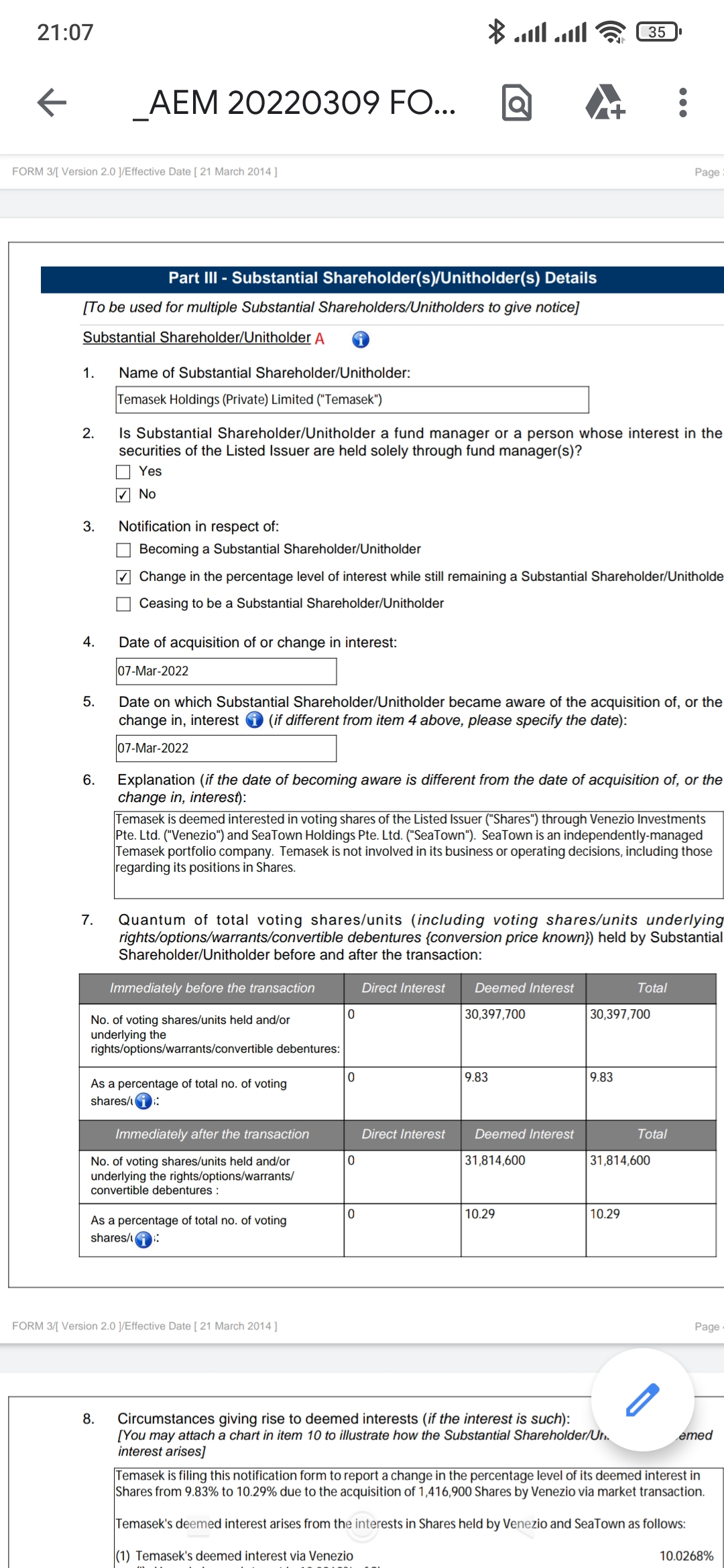 $AEM HOLDINGS LTD(AWX.SI)$Temasek Holdings just bought 1.4 million of shares on 7 March, total holding increased from 9.8% to 10.2%. Price bought should be in the $3.9X range and this should provide support to the share price.