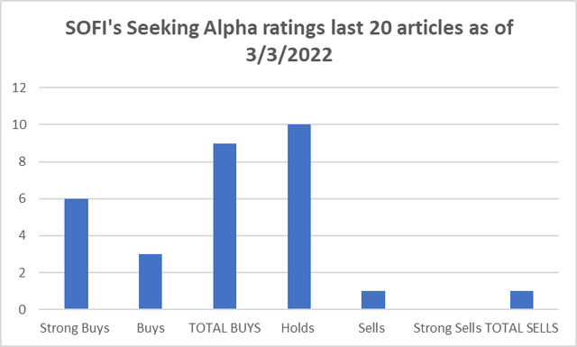 On the other hand, 10 of the last 20 articles on SOFI by Seeking Alpha contributors have a rating of "Hold" showing caution when extrapolating SOFI's performance going forward, especially with the rather weak Q1 2022 projections.