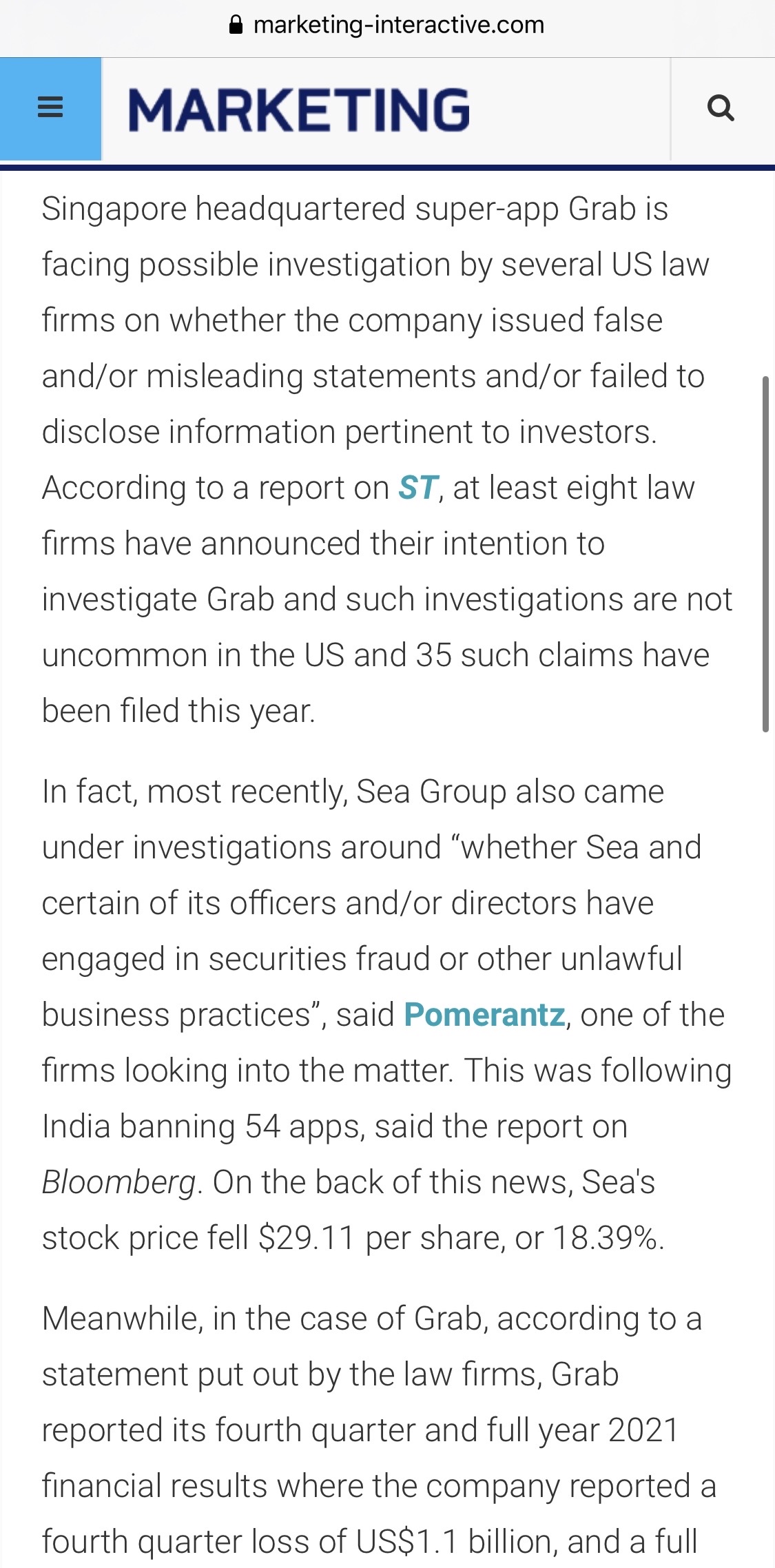 $Grab Holdings(GRAB)$Grab face possible investigate in US over misleading financial statements. Fail to disclose information to investors, false & misleading statements. At least 8 law firm have announce their intention to against Grab.