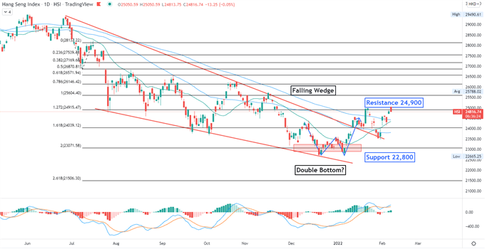 - The HSI breached above a “Falling Wedge” pattern, opening the door for further gain