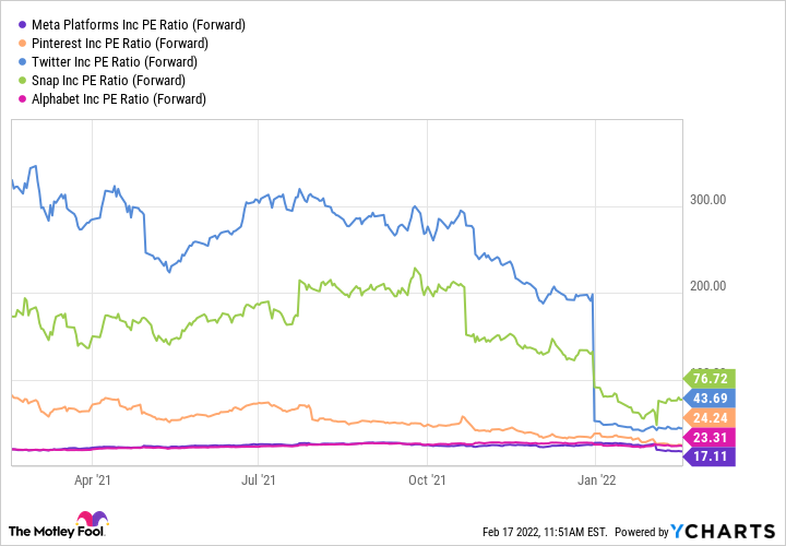 Meta Platforms' shares have gotten a lot more affordable lately. It is worth comparing the tech giant's forward price-to-earnings ratio to those of several other social media giants, namelyPinterest,Twitter,Snap, as well as Google and YouTube parentAlphabet.
