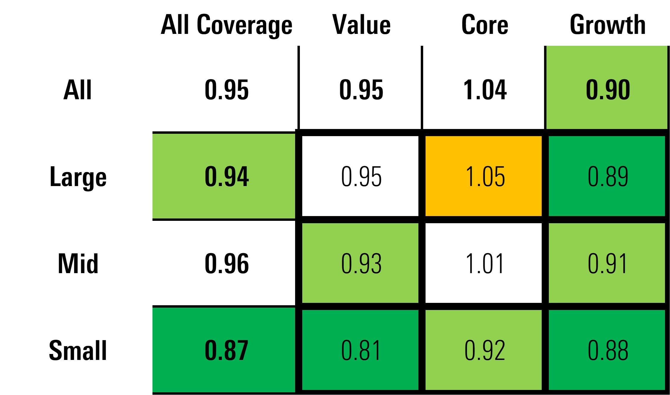 The market price to fair value is a composite derived from the intrinsic valuations as determined by our equity research team of the stocks we cover that trade on US exchanges. Values > 1 are considered overvalued and < 1 are undervalued.