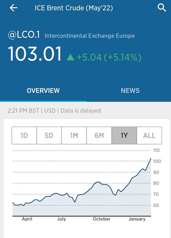 International benchmark Brent crude advanced 6.3% to trade at $104.16 per barrel. The contract rose to $105.79 last week, the highest since 2014$United States Brent Oil Fund LP(BNO)$