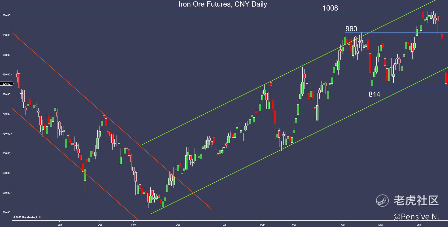 - Iron ore tried to break above major resistance at 1008 (again), but failed (again), and has tumbled lower to the bottom of its range at 814